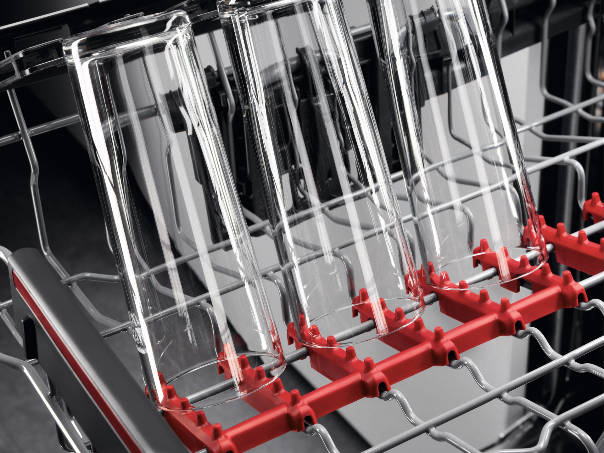 Horní košík má 2 červené měkké špičky, skládací poličky na šálky, plastové barevné madlo